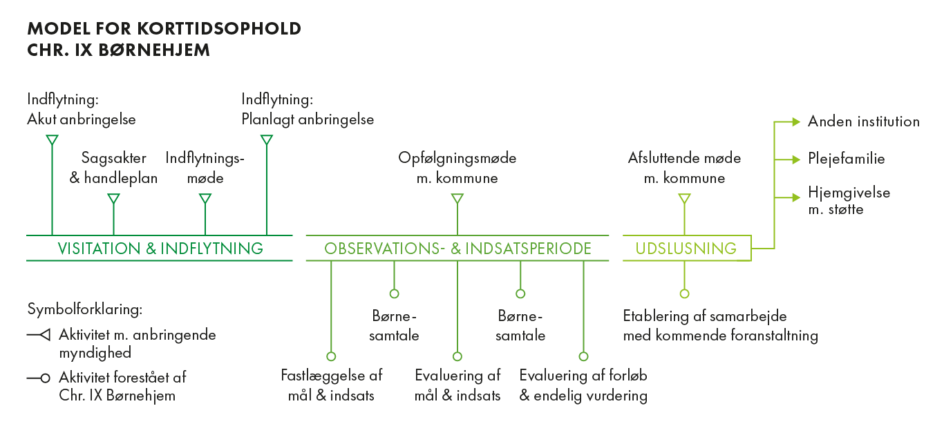 Døgnophold på Chr. IX Børnehjem er altid midlertidige, tids- og målfokuserede forløb. For alle børn opstilles der mål, som der løbende følges op på, og anbringelserne følger en fast struktur, som fremgår af korttidsmodellen nederst.